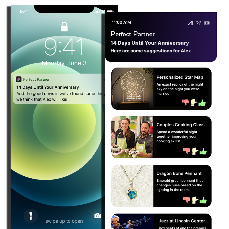 GyftIQ searches through millions of gift sites, local event calendars, and unique experiences near you and curates those choices down to five a day. You continue to train GyftIQ by rating the suggestions improving results over time.